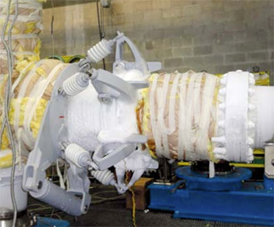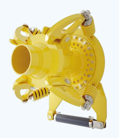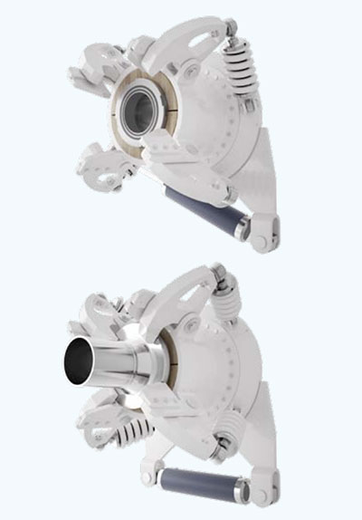 The QCDC clamps are radially mounted around the fluid carrying body and connected via high stiffness spring rods to a rotating collar which is mounted on the body