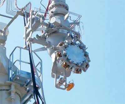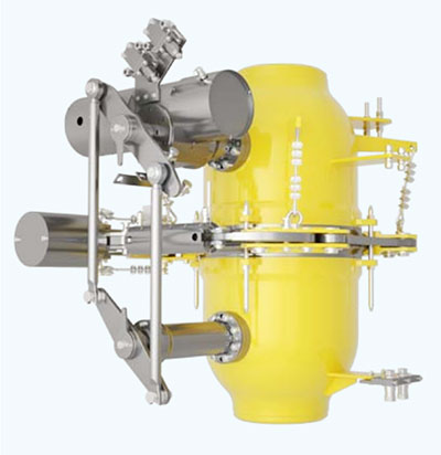 A shear pin is fitted to the releasing fork to give added security against manual accidental activation. In the event of an emergency release being required, the hydraulic system will first close the ball valves and then disconnect the ERC. The actuation of the ERC hydraulic cylinder breaks the shear pin and moves the releasing fork from the locked to the unlocked position. The stored energy in the spring pack is then released and transmitted via the tie-bar to the clamps, freeing them from the middle flanges. The loading arm side and tanker side valves are now free to separate.