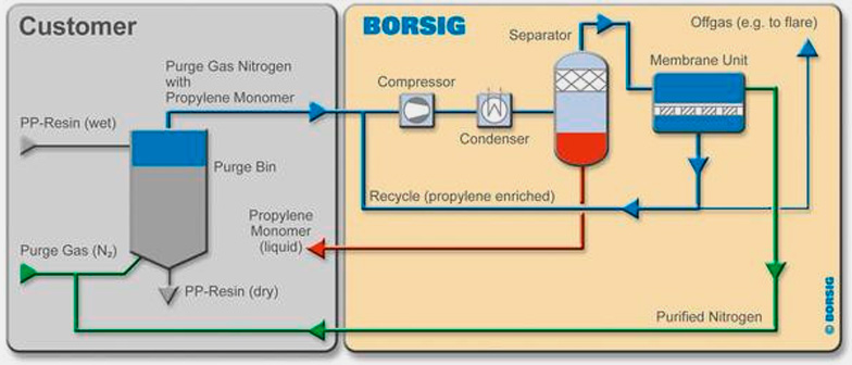During the production of polypropylene (PP) one typical process step is the degassing of PP resin in the resin bin in order to purge out non-reacted propylene monomer. Typically nitrogen is used and continuous purge streams containing substantial content of monomer have to process to minimise the loss of profit and the required flare gas capacities: