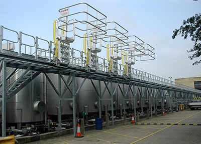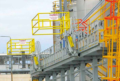 The Folding stairs are mounted on a carriage which rolls, using high quality bearings, along a special track system. The track is available in two, three and four metre long sections and can be retro tted to most platforms. This system is used extensively where tankers are pulling alongside multiple storage tanks to discharge.
